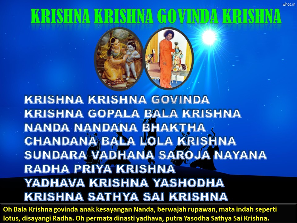 Oleh karena itu kerinduan/kehausan untuk Sri Krishna adalah tanda kesehatan dalam bidang spiritual. Pengulangan nama Sri Krishna tidak akan ada gunanya, kecuali jika kontemplasi/ perenungan kemuliaan Sri Krishna mulai memurnikan karakter-mu. Berkat Tuhan sangat kuat dan hanya yang pantas mendapatkannya yang akan diberkati. Oleh karena itu mulai saat ini murnikanlah karakter-mu dengan takwa dan pengabdian. Maka engkau akan mendapatkan Berkat Tuhan. -Sathya Sai Baba-