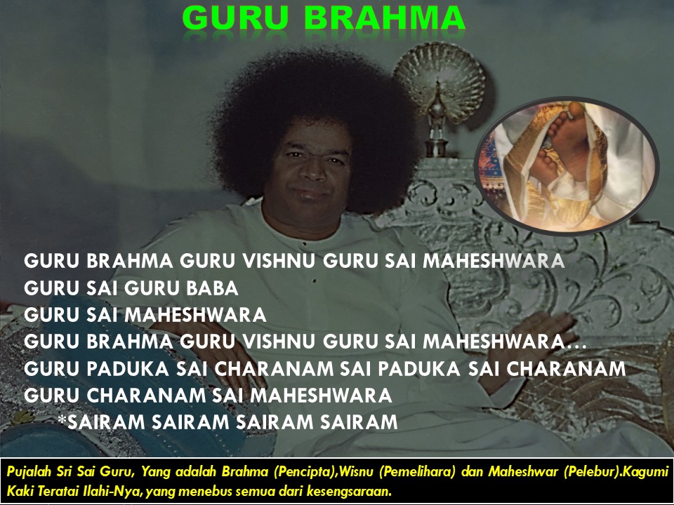 Sembah sujud di Kaki Sad Guru yang senantiasa membibing kita kejalan kebenaran, mari menyanyikan kemuliaanNya: Guru Brahma Guru Vishnu Guru Sai Maheshwara