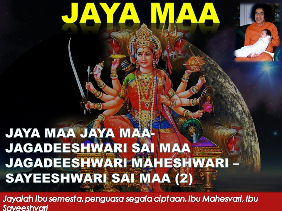 Kemuliaan bagi Dewi penguasa semesta, yang menyucikan karma-karma kita, mari memujaNya: Jaya Maa, Jaya Maa