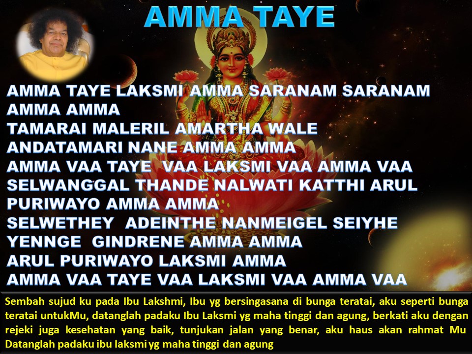 Sembah sujud dihadapan Ibu Lakshmi yang memberkati kekayaan, kesehatan dan rejeki bagi hidup kita. Mari kita memulikannya dengan menyanyikan lagu : Amma Taye Laksmi Amma