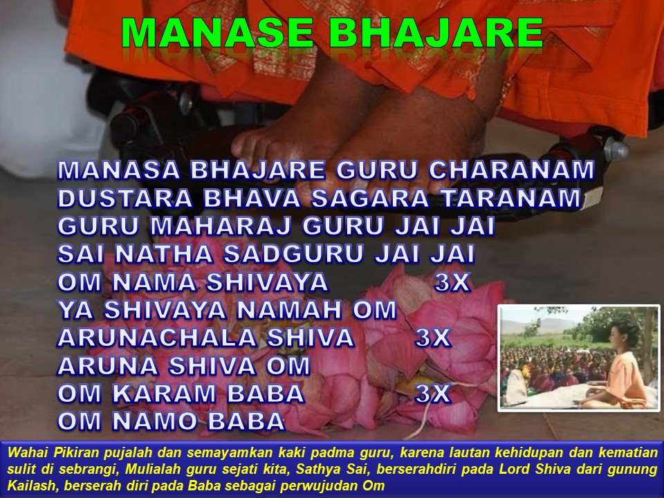 Selamat beraktivitas dan bertugas sambil terus merenungkan dan memegang kaki Sad Guru yang meleyapkan penderitaan kita, mari menyanyikan bhajan ini bersama Bhagawan: Manasa Bhajare