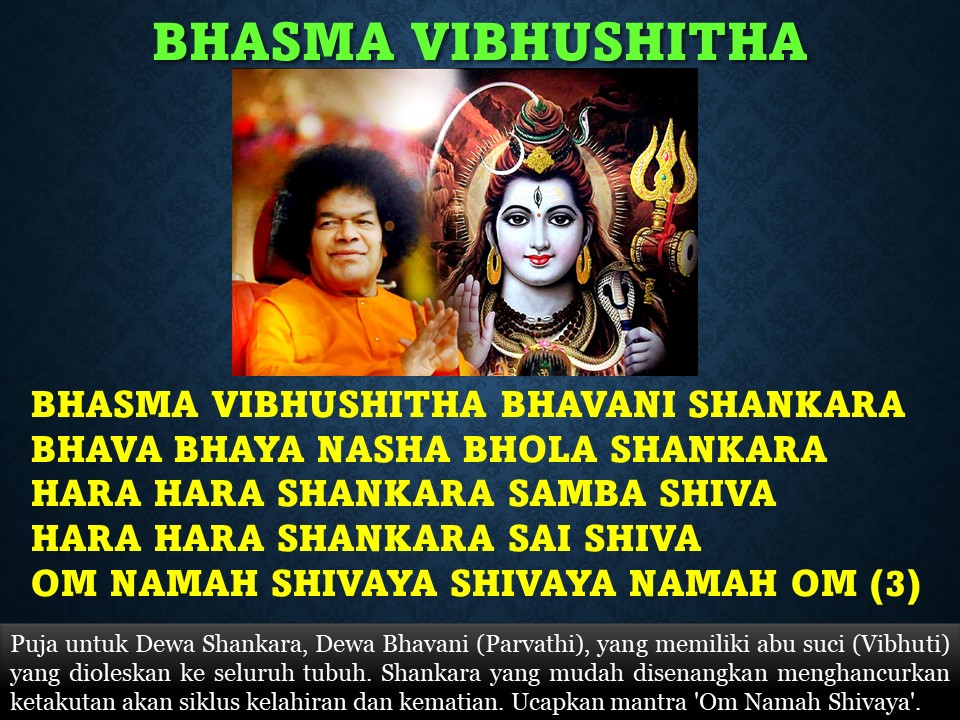 Semoga kasih Swami senantiasa menuntun kita selalu, ,mari menyanyikan kemuliaan Beliau yang diliputi Vibhuti : Bhasma Vibhushitha Bhavani Shankara