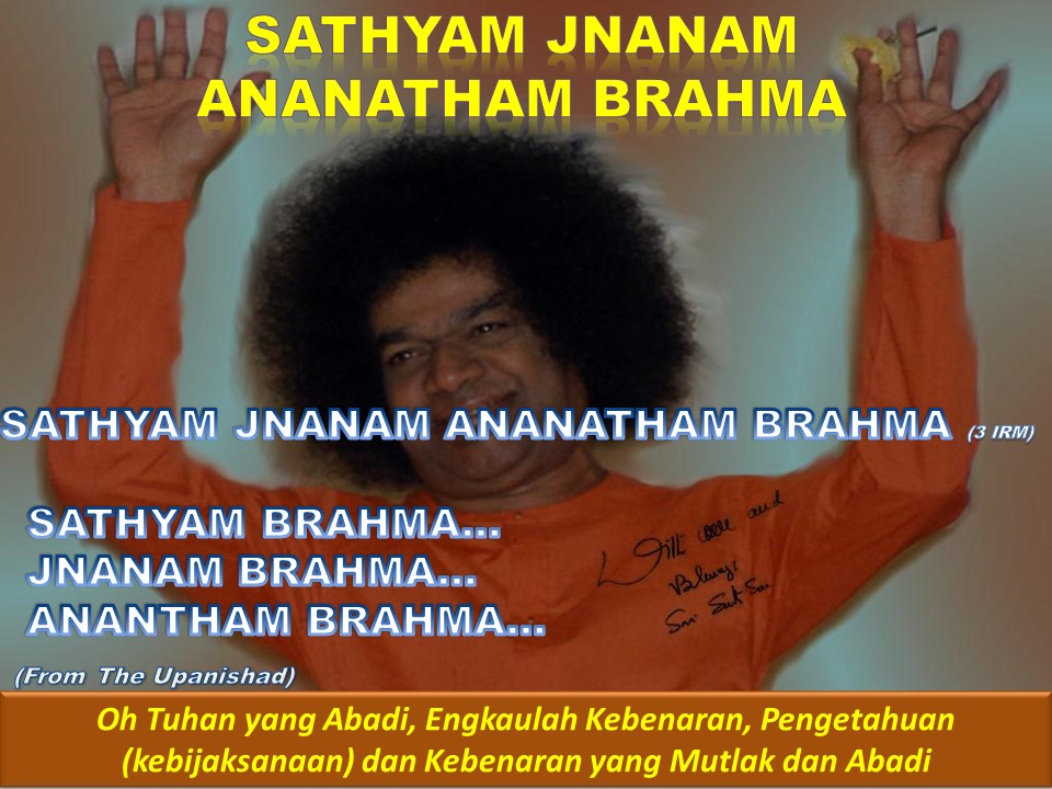 Untuk setiap ciptaan yang lahir ke dunia, kebenaran adalah manisfestasi Tuhan yang bisa terlihat. Seluruh kosmos terdiri atas objek-objek yang bergerak dan tidak bergerak yang muncul dari kebenaran, ditopang oleh kebenaran dan menyatu di dalam kebenaran. Kebenaran adalah illahi dan kekal (Sathyam-Jnanam-Anantham Brahma). Oleh karena itu setiap orang harus menghormati kebenaran. Sathya dan Dharma (kebenaran dan kebajikan) tidak akan tunduk kepada siapapun. Setiap bagian dari kekuatan, fisik atau sebaliknya harus berada di bawah kekuasaan dari Sathya dan Dharma. Keberhasilan mengikuti Sathya dan Dharma. Apapun yang menjadi gelar sarjanamu atau kedudukanmu, engkau harus meningkatkan rasa hormat pada nilai-nilai kemanusiaan. (Divine Discourse, 20-May-1990)