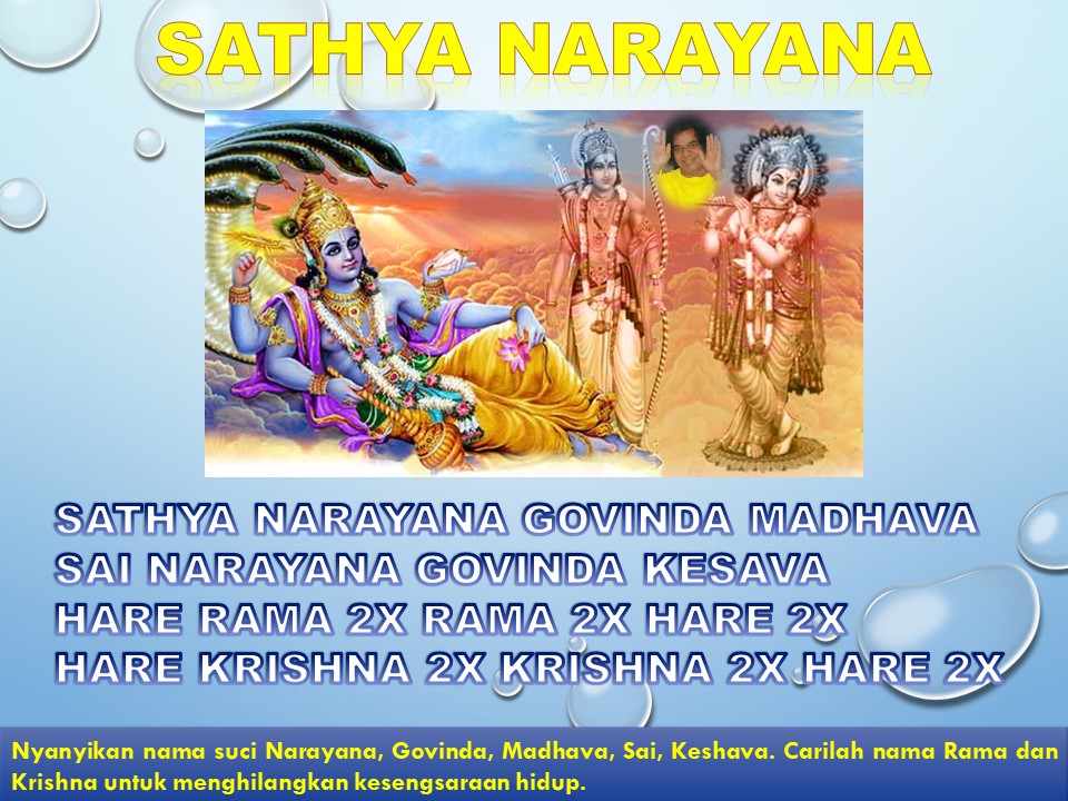 Hasil dari melantunkan nama suci Rama, Krishna, atau nama suci Tuhan yang lainnya akan dapat dialami oleh siapapun juga, ketika dilantunkan secara terus menerus dengan hati yang suci dan ketika diserap dalam pikiran! Hanya nama suci Tuhan yang akan membantumu mengendalikan semua bentuk liku-liku dari indera yang menyeretmu jauh menuju pada kesombongan! (Divine Discourse, 1 Jan 1967)