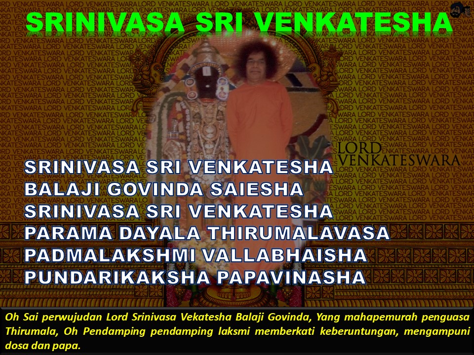 Semoga Sai, Srinivasa memberkati pengampunan atas dosa yang kita lakukan, mari menyanyikan kemuliaan Beliau: Srinivasa Sri Venkatesha