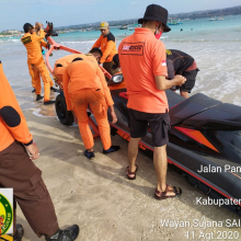 KEDONGANAN --- Akhirnya tim SAR gabungan berhasil menemukan nelayan yang sempat hilang saat jukungnya dihantam ombak. Korban ditemukan pada Selasa (11/8/2020) kira-kira pukul 18.05 Wita oleh nelayan yang sedang melaut. Kepala Kantor Pencarian dan Pertolongan Denpasar (Basarnas Bali), Gede Darmada, S.E., M.AP. selaku SMC mengungkapkan kronologis singkat penemuan korban. "Jenasahnya ditemukan oleh nelayan asal Peti Tenget, nelayan tersebut melihat tubuh terapung-apung dan langsung mengangkatnya ke dalam sampan," terang Darmada (Kord Sai Rescue). Lokasi penemuannya pada jarak 4,5 NM arah 355° dari LKP (koordinat 08°40’34,4’’ S – 115°8’32,1’’E), selanjutnya dibawa ke Dermaga Kedonganan. Laporan penemuan itu didapat petugas siaga Basarnas Bali dari Polairud Kedonganan atas nama Made Sumitra.